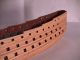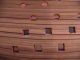 Once the gunports were cut out, I painted the inside of the gunports with a reddish brown paint (Humbrol 100 Red Brown). This paint is more or less similar to red ochre. Some artists and period models show a much brighter shade of red, but I’m not convinced this is correct. I believe the brighter red was used by the artists of the period as artistic license. This coat of paint highlighted several flaws in the gun port lintels that were filled with Tamiya plastic modeling putty and sanded smooth. This process was continued until all of the gunport lintels were free from major blemish. A final coat of red brown was applied to finish off the gunports. There were other gaps in the planking, but luckily they were in areas that were to be painted black, like at the top of the hull sides. Once all the putty and paint were dry, it was time to sand down the hull and smooth off the planking.
