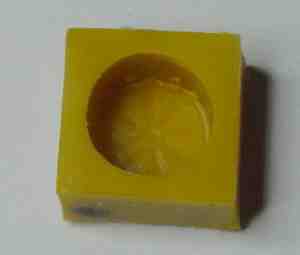 C'est un caoutchouc très souple , et en même temps extrèmement résistant au déchirement. J'ai été capable de mouler à partir du moule de la base (photographie ci-dessous, le plus petit des moules) 27 pièces parfaites. Après cela, un des petit tétons pour définir les trous (longueur et diamêtre de 3/64") s'est partiellement arraché. Les autres moules avec moins de détails difficiles sont capaple j'en suis sur de mouler beaucoup d'autres pièces.