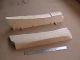 The pictures of this process are presented in chronological order. The pictures show the hull halves at various points in their carving and shaping. One picture shows the rough carved one hull half with the other just cut on a bandsaw to the outside major lines. The other shows one hull half rasped and rough sanded a little closer to shape to establish the proper exterior contours. When the other half is carved I will put them together (I have fitted dowels to the interior) and finish the shaping as a whole unit.