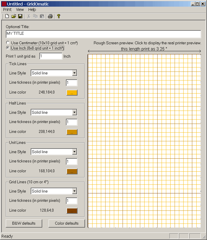 Ceci montre un réglage pour une imprimante couleur, avec les couleurs par défaut. L'unité sélectionné est le pouce, et la partie droite affiche l'équivalent de 3" 1/4 (3.25"). Les couleurs par défaut peuvent être changées en cliquant sur les boutons de couleurs.
